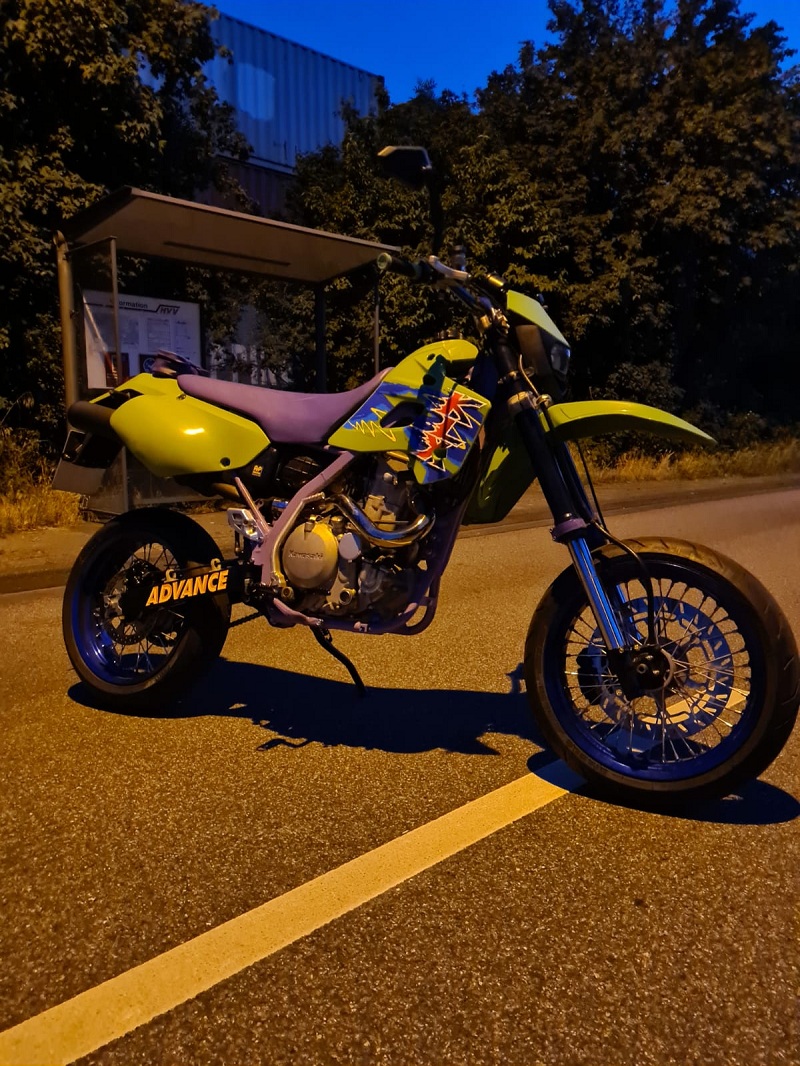 Das Projekt von meinem Sohn und mir. Bj.93 Supermoto Umbau, andere Lampenmaske, 320mm Bremsscheibe, Radial Bremspumpe, Eigenbau Kettenschutz. Noch mit unbearbeiten Rahmen und Kleinteilen. |