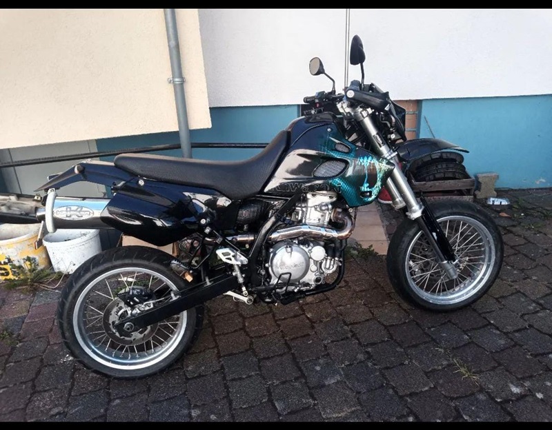 Das Projekt von meinem Sohn und mir. Bj.93 Supermoto Umbau, andere Lampenmaske, 320mm Bremsscheibe, Radial Bremspumpe, Eigenbau Kettenschutz. Noch mit unbearbeiten Rahmen und Kleinteilen. |